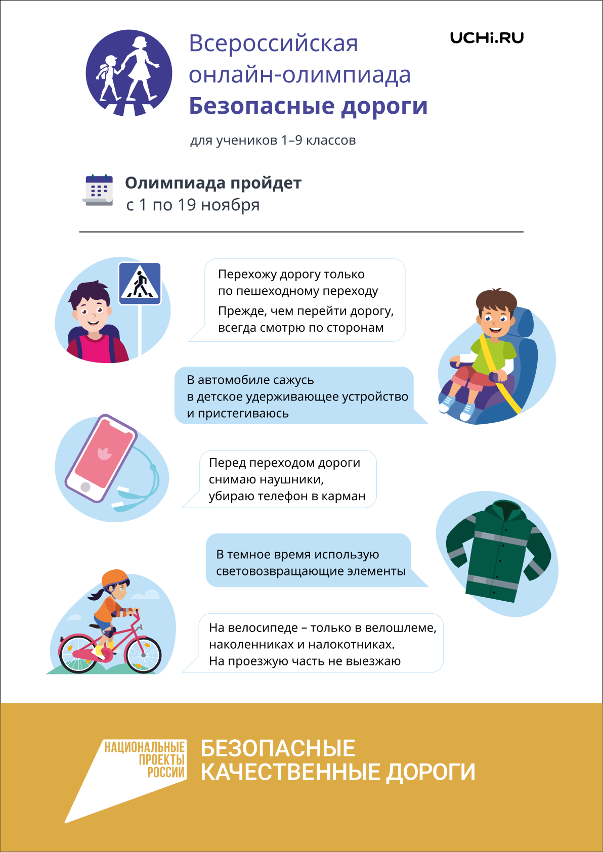 Рекомендуем родителям вместе с детьми поучаствовать в олимпиаде по ПДД «БЕЗОПАСНЫЕ ДОРОГИ». Всероссийская онлайн-олимпиада для обучающихся 1- 9 классов на знание основ безопасного поведения на дороге пройдет на образовательной платформе Учи.ру с 1 по 19 ноября 2021 года.