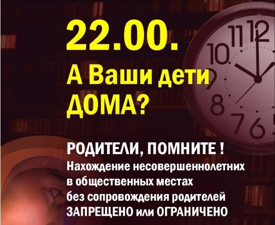 С 22:00 до 06:00 детям запрещено находиться на улице без сопровождения родителей или законных представителей.