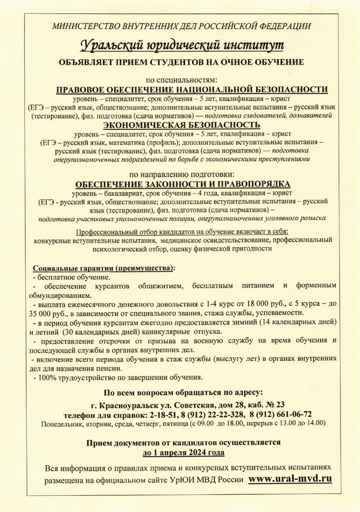 Уральский юридический институт объявляет прием студентов на очное отделение
