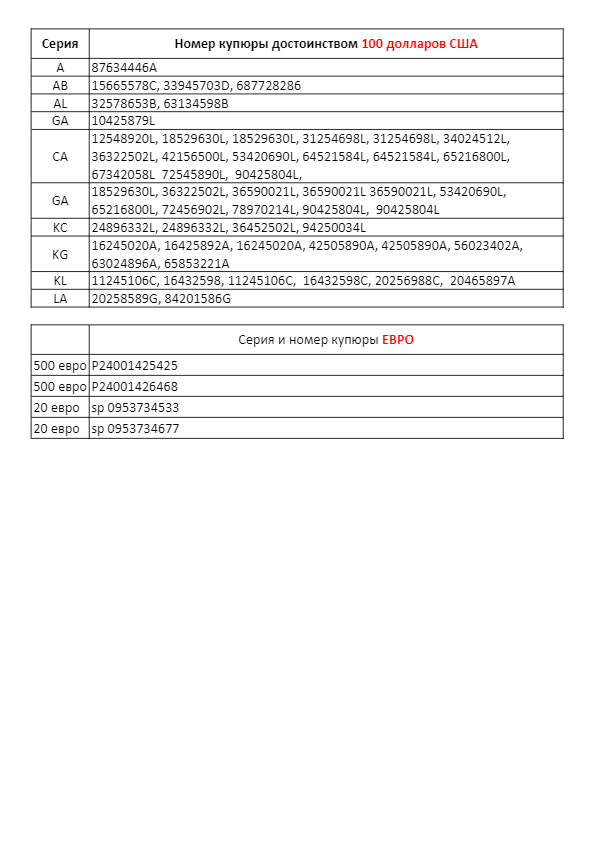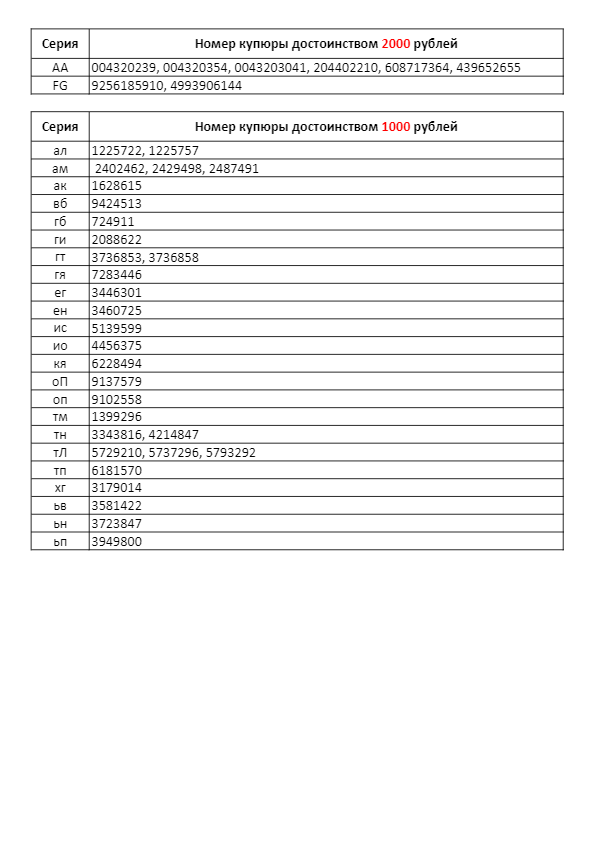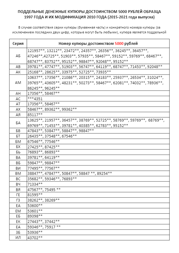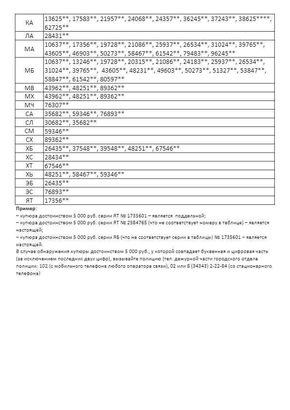 Если вы обнаружили денежные купюры с признаками подделки или их серии и номера соответствуют номерам указанным в приведенных таблицах – незамедлительно обратитесь в дежурную часть ОМВД России по г. Красноуральску лично или по телефону 102 (звонок с мобильного телефона любого оператора связи бесплатно), по телефону 02 или 8 (34343) 2-22-84 (со стационарного телефона)