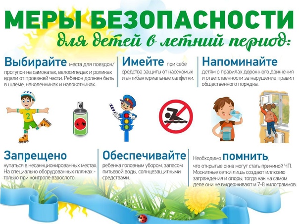 — Безопасность поведения детей на улице и в зонах движения автотранспорта. В летний период дети часто проводят свободное время без присмотра взрослых на улице. Это создает дополнительные риски травматизма, попадания под колеса автотранспортных средств, похищений детей.